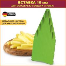 Дополнительная  вставка «Прима» с ножами 10 мм  на 25%  расширяет возможности основного комплекта овощерезки.  При нарезке на вставке 10 мм получаются большие брусочки и кубики из овощей и фруктов, крупнее, чем на вставках из основного комплекта овощерезки. Прекрасная толщина для нарезки...