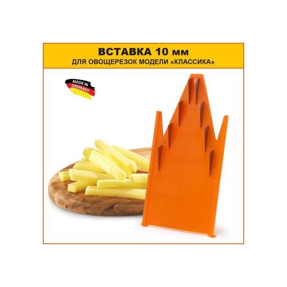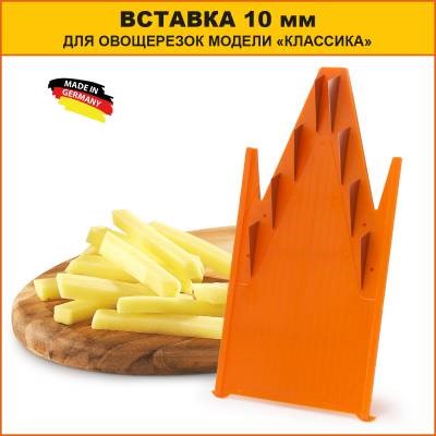Дополняет основной комплект овощерезки. Нарезка брусочками и кубиками, более крупными, чем на вставке 7 мм из стандартной комплектации. Прекрасная толщина для нарезки картофеля для жарки. Вставка с ножами 10 мм, более крупными, чем в стандартном комплекте овощерезки. Расстояние между ножами 10 мм. При нарезке на этой вставке получаются большие брусочки овощей и фруктов. Особенно хорош картофель для приготовления его во фритюрнице. Из лука и капусты у вас получатся крупные кубики.