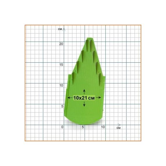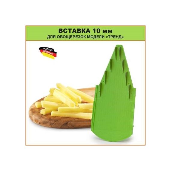 Вставка с ножами 10 мм, более крупными, чем в стандартном комплекте овощерезки. Расстояние между ножами 10 мм. При нарезке на этой вставке получаются большие брусочки овощей и фруктов. Особенно хорош картофель для приготовления его во фритюрнице. Из лука и капусты у вас получатся крупные кубики.
