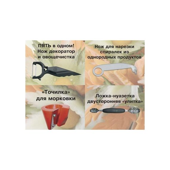 Набор инструментов для декоративного вырезания и украшения праздничных блюд "ЖДЕМ ГОСТЕЙ" Полное описание: В набор входят: 1.Нож-декоратор и овощечистка: Мульти-овощечистка - многофункциональная и очень простая в использовании.Чистка любых овощей и фруктов. Имеет пять функций для декоративных украшений. Любые овощи и фрукты можно чистить основным лезвием ножа