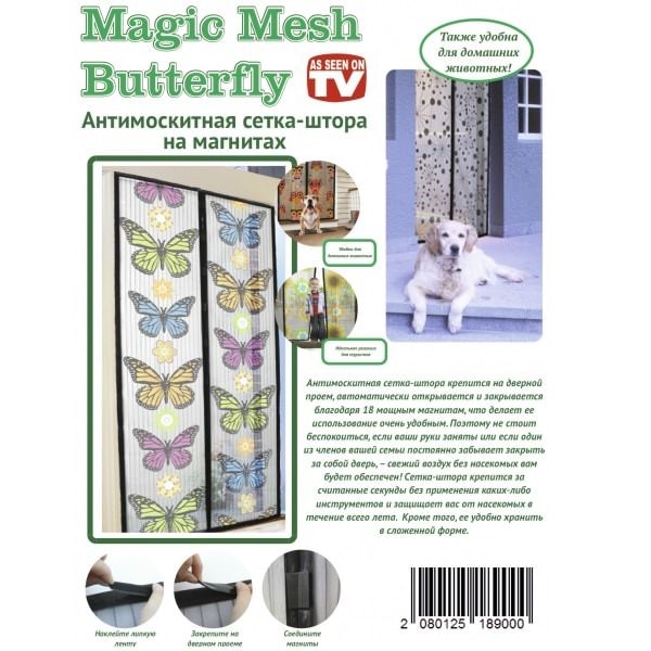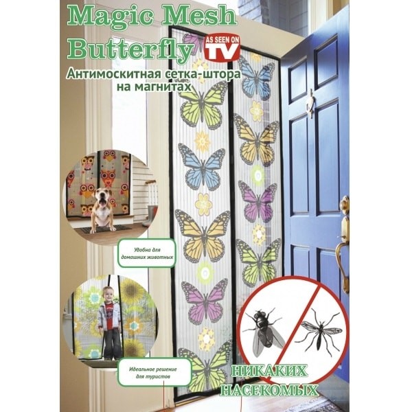 Москитная сетка Magic Mesh Butterfly (Меджик Меш Баттерфлай) на магнитах крепится на проем двери при помощи двусторонней липкой ленте или прикалывается кнопками. Когда вы проходите, благодаря магнитам штора за вами обратно закрывается. Хорошо работает даже при сильном ветре.