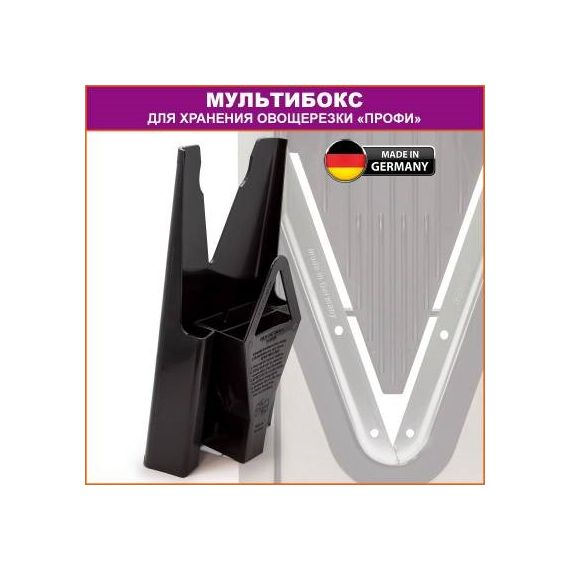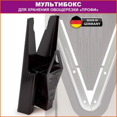 Если вы приобрели тёрку в комплектации без мультибокса, то сейчас вы можете его докупить. Хранить тёрку в мультибоксе очень удобно, практично и безопасно. Наши овощерезки известны во всем мире тем, что имеют очень острые лезвия. В мультибоксе овощерезка будет стоять компактно на вашей кухне: всегда рядом на кухонном столе готовая к работе, но при этом острые ножи надёжно закрыты и все составные части собраны вместе.