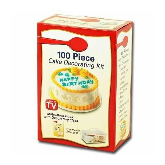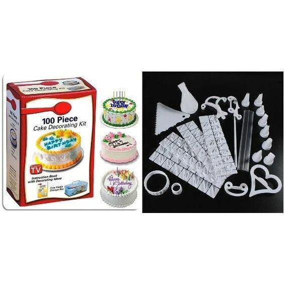 Потрясающий набор для кондитеров 100 Piece Cake Decorating Kit состоит из 100 насадок для работы с кондитерской глазурью, шприцы и мешочки для крема, фигурные насадки для крема, резаки для глазури в форме сердечек, звездочек, лепестков, гирлянд. Бесконечное множество трафаретов для надписей, декоративных цветов из сливочного крема, грибочков, виноградной лозы и прочих необычных украшений на торт. Обращаем внимание, что трафареты для написания текста – это английский алфавит.
