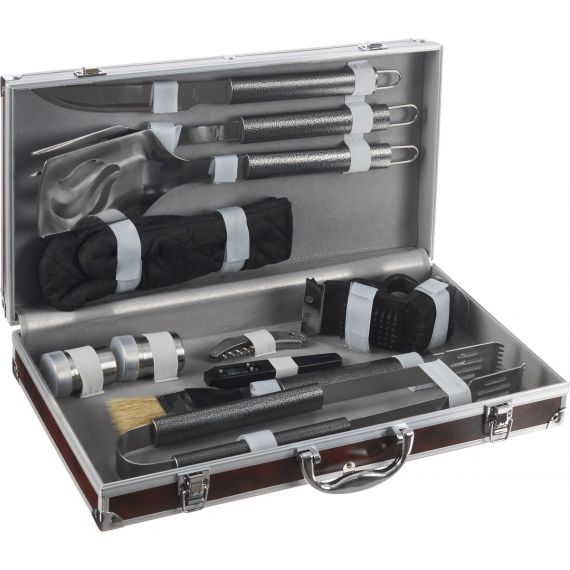 Набор для барбекю "Borner" включает: нож для мяса, вилку для мяса, кисточку, щипцы для мяса, термометр для мяса, лопатку для гамбургеров, две емкости для соли и перца, штопор-нож, прихватку-варежку, щетку-скребок для чистки решетки. Предметы набора вложены в чемодан и надежно зафиксированы резинками и контактной лентой. Состав: - длина лопатки: 44 см, - наибольшая ширина рабочей поверхности лопатки: 10 см, - общая длина ножа: 41 см, - длина лезвия ножа: 16,8 см, - длина вилки: 44,5 см, - длина щипцов: 41,5 см, - длина кисти: 38 см, - длина щетины кисти: 4,5 см, - диаметр емкости для специй (по верхнему краю): 4 см, - высота емкости: 6,2 см, - длина термометра: 15 см, - длина штопора: 11 см, - длина варежки: 28 см, - размер щетки: 16 см х 9,5 см х 7 см.