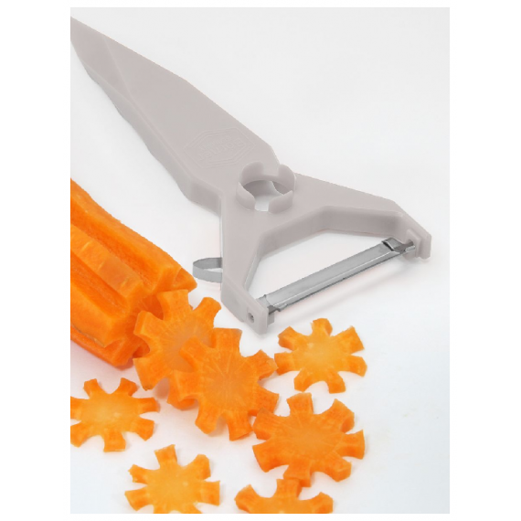 Нож овощечистка-декоратор (пять в одном). Незаменимый удобный прибор, с помощью которого можно не только легко почистить овощи, но и моментально украсить различные блюда, а так же нарезать продукты тонкими пластами. Нож идеально тонко и легко чистит овощи и фрукты благодаря плавающему лезвию, имеющему двустороннюю заточку под правую и под левую руку. Кроме того, заводом применён принцип системы активной безопасности от порезов "SAFE-BLADE" и этим ножом может пользоваться даже ребёнок. Лёгкая, компактная многофункциональная овощечистка-декоратор всемирно известного немецкого завода BORNER моментально станет вашей любимицей, сделает вашу работу на кухне приятной и творческой. Все подробности изготовления украшений изложены в инструкции к ножу.