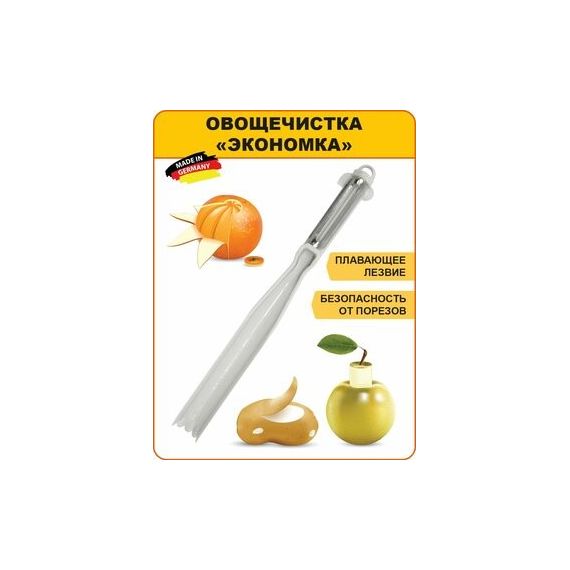 Нож-овощечистка модели "Экономка" - это незаменимый удобный прибор традиционной и привычной формы, который идеально тонко и легко чистит овощи и фрукты благодаря плавающему лезвию, имеющему двустороннюю заточку под правую и под левую руку. Кроме того, заводом применён принцип системы активной безопасности от порезов "SAFE-BLADE" и этим ножом может пользоваться даже ребёнок. Лёгкая, компактная овощечистка благодаря особенностям конструкции ручки может удалять сердцевину яблока и чистить апельсин.