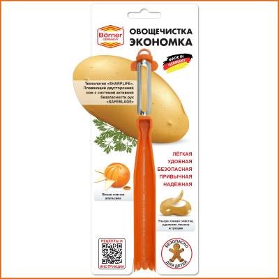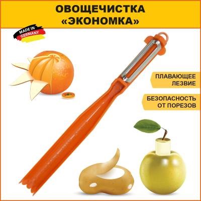 Нож-овощечистка модели "Экономка" - это незаменимый удобный прибор традиционной и привычной формы, который идеально тонко и легко чистит овощи и фрукты благодаря плавающему лезвию, имеющему двустороннюю заточку под правую и под левую руку. Кроме того, заводом применён принцип системы активной безопасности от порезов "SAFE-BLADE" и этим ножом может пользоваться даже ребёнок. Лёгкая, компактная овощечистка благодаря особенностям конструкции ручки может удалять сердцевину яблока и чистить апельсин.
