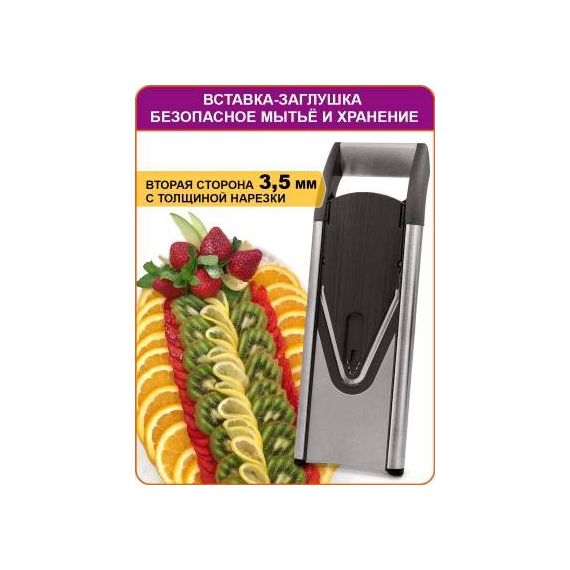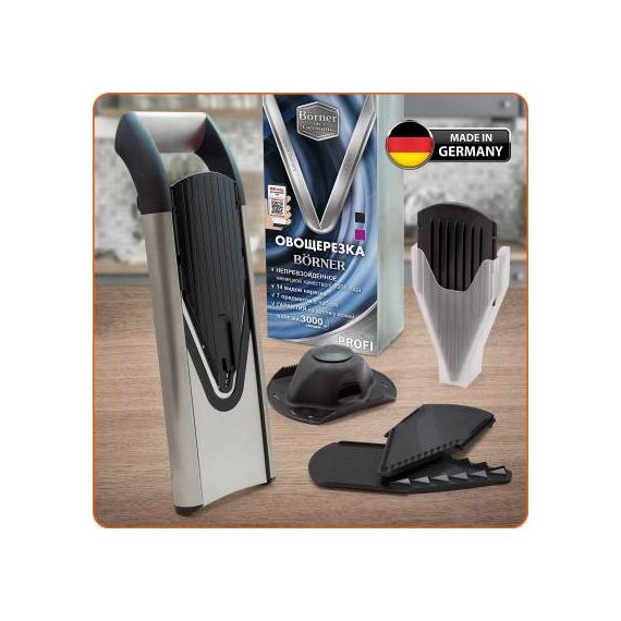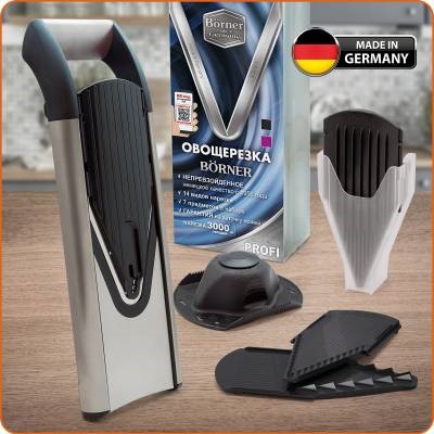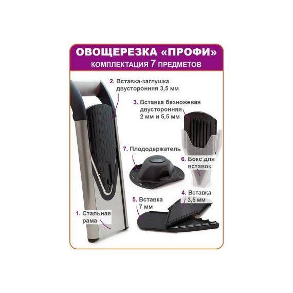 Модель "Профи" — это комплект "Тренд" в стальном корпусе плюс вставка "zero" (которая дает еще одну толщину нарезки и закрывает лезвия V-ножей при хранении) и плюс бокс для хранения вставок.