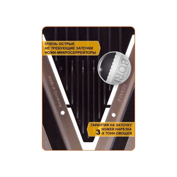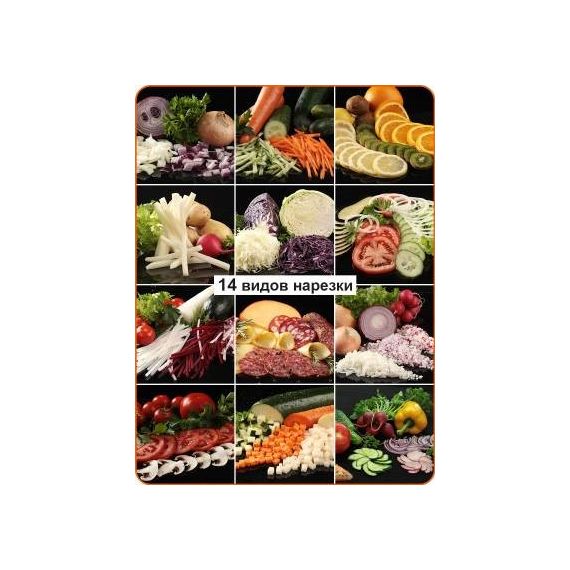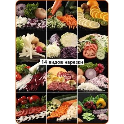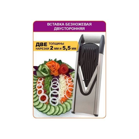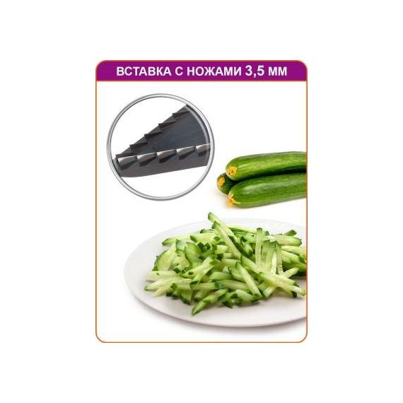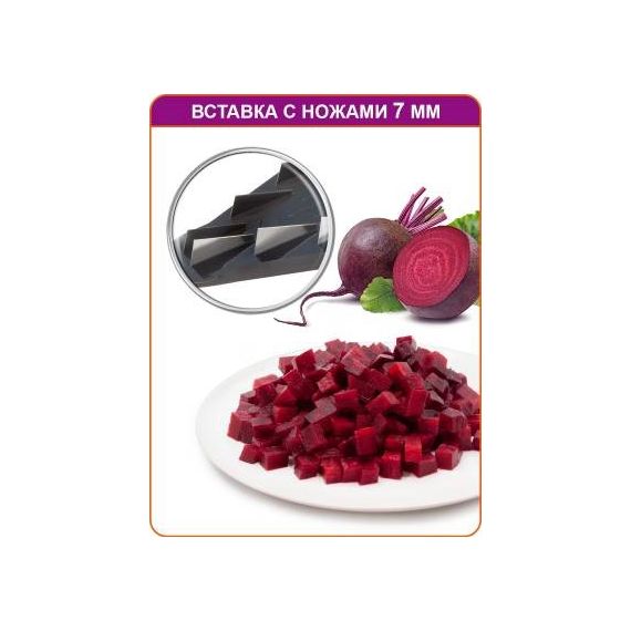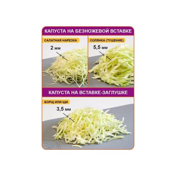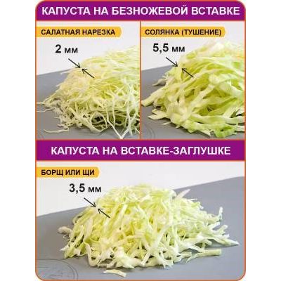 - При помощи вставки с крупными ножами Вы без труда, за считанные секунды, порежете картошку длинными брусочками для жарки, овощи кубиками в салат, капусту крупными кубиками для солянок, борщей и щей.