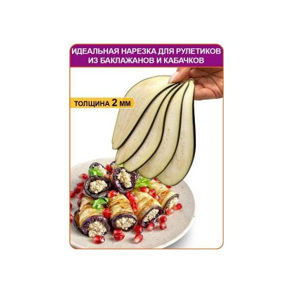 - Когда Вы начнете резать с безножевой вставкой, то сразу же поймете, что нарезка ничем не отличается от нарезки привычным Вам кухонным ножом. Только раньше вы двигали ножом по продукту, а теперь продуктом по ножу. Если это капуста – то при нарезке получится соломка; если это лук, помидоры, огурцы, кабачки, лимон, колбаса и т.п.– то это будут кольца. Ну, а если Вы положили баклажан длинной стороной – получатся длинные пласты-стельки, которые потом удобно обжарить, нафаршировать и получить великолепные рулетики.
