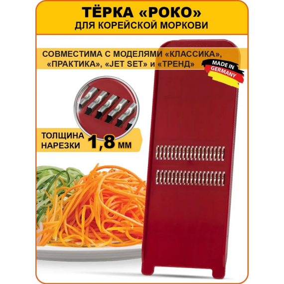 Овощерезка немецкого завода Borner "Роко" из модельного ряда "Тренд" уже 20 лет известна российскому покупателю. Она делает несколько видов нарезки, но наиболее популярна нарезка тонкой соломкой, которую мы традиционно называем "корейская морковь", а европейцы называют "жульен". Толщина соломки равна 1,6 мм при круглом сечении. Этот способ нарезки даёт возможность делать салаты в наиболее нежной консистенции и ускоряет время приготовления горячих блюд.