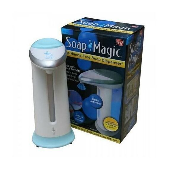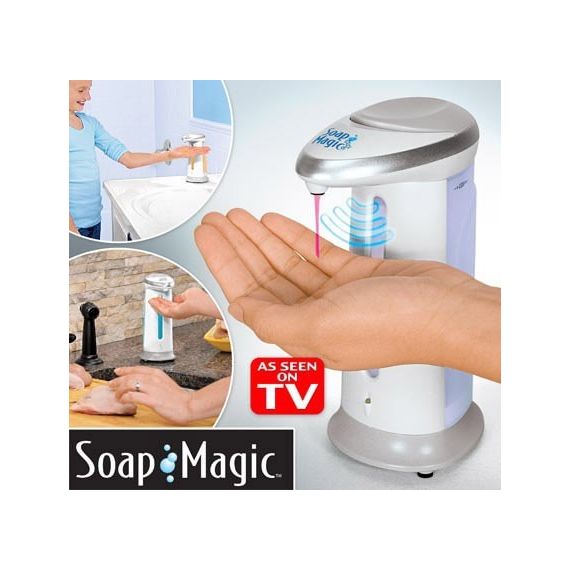 Новая дезинфицирующая мыльница работает «hands-free». Заполните емкость мыльницы средством для мытья посуды, мылом для рук или дезинфицирующем средством и просто поднесите руки к носику гаджета. Мыльница автоматически выберет необходимую дозу средства и сигналом сообщит вам о завершении работы. Можете поставить ее как ванной комнате, так и на кухне. Автоматический сенсорный дозатор Soap Magic поможет сохранить Ваши руки в чистоте, кроме того, позволяет очень экономно расходовать мыло.
